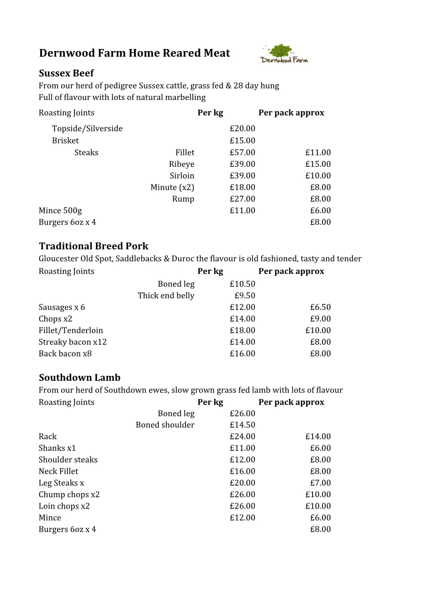 Dernwood beef is bred from the traditional Sussex breed of cattle. They graze on lush pastures during the summer period, and are kept in large open barns in winter. They are fed on home grown hay & silage. The meat is hung for 28 days, which intensifies the flavour & taste.